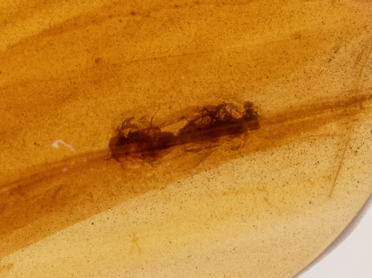 Two Flies or Fleas Captured Mid-Coitus in 100 Million Old Burmite Amber. Two mating flies or fleas measuring approximately 4 mm in a clear honey colored amber cabochon measuring 13 x 10 mm from Burma. The two brown flying insects are very clearly displayed in this 100 million year old amber cabochon. This is one of the oldest fossil records of mating insects being preserved during mating. Preserved in a 8 x 6" Riker mount with an enlarged photo of the rare, randy insects. Estimate Value $800 - UP