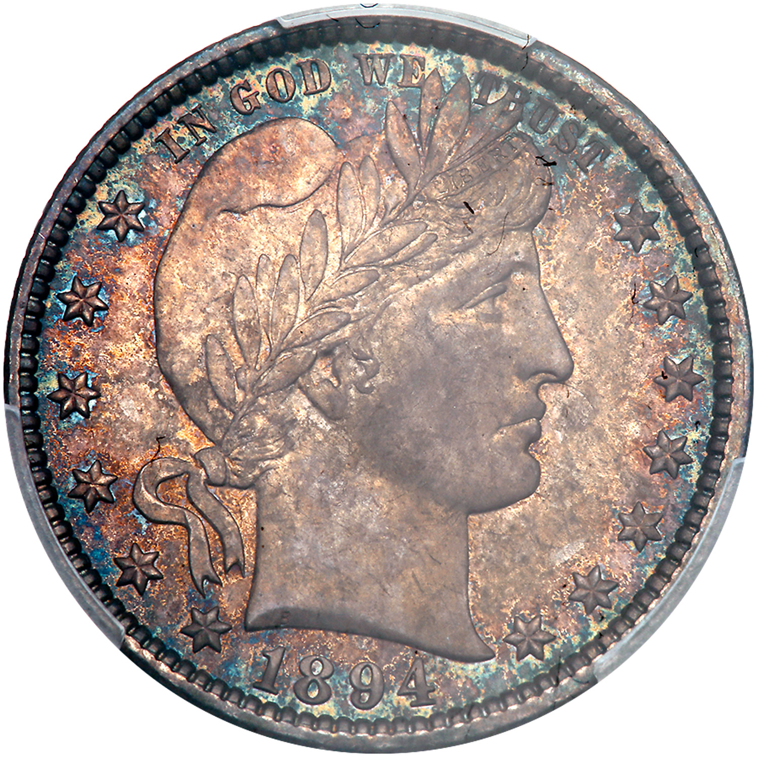 1894-O. PCGS graded MS-66. Glorious toning on both sides overwhelmes the senses with teal and russet hues with the fields retaining their fiery flash as imparted from the mint. The stirke is sharper than most New Orleans quarters of this period, and of course the surfaces are exceptional to attain this grade level from PCGS. This is simply a fantastic coin for the collector. Well struck with lovely deep toning on both sides. Pop 11; 4 finer, 3 in 66+, 1 in 67. (PCGS # 5608) Estimated Value $3,500 - UP