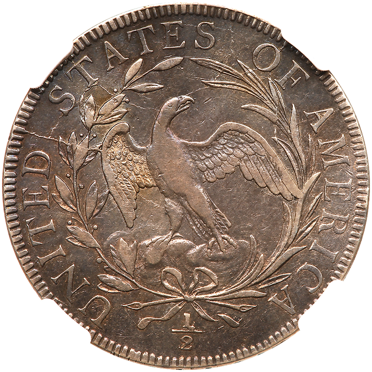 1797 is the key date Bust half dollar and the rarest half dollar in Type in the entire United States series. The design of the Draped Bust obverse with the Small Eagle reverse was used only in 1796-97 when the Heraldic Eagle reverse was adopted (in early 1798 on dimes, but half dollars weren't struck again until 1801, thus no half dollars were struck from 1798 through 1800). The minuscule mintage tells the story once more since the total struck was recorded as 2,984 pieces for the year. Precious few are known today, particularly in high grades.