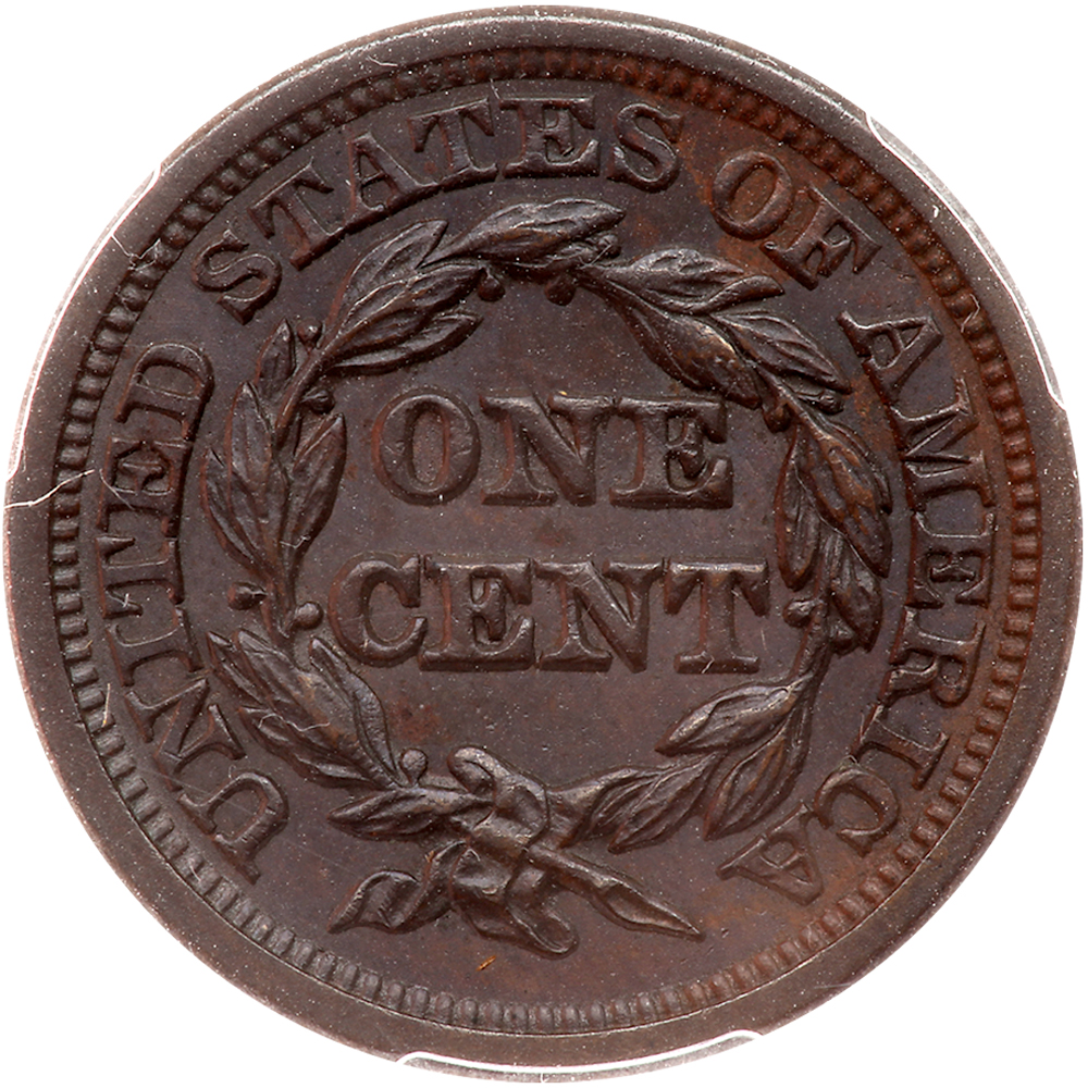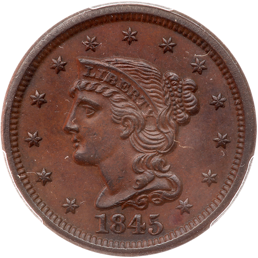 1845 N-11 R3 PCGS graded MS62 Brown. Frosty medium brown and light chocolate with darker steel brown and olive toning on the reverse. Just a few minor contact marks including a vertical nick on the jaw over the throat, a small nick hidden on the forelock, and a collection of tiny ticks on the truncation over the 8. E-MDS, die state a. The fine die lines at NT in CENT and over ER in AMERICA are visible and the rim cud at stars 3-4 reaches down slightly below star 3. Our grade is AU58, tied for CC#11 in the Grellman census. The attribution is noted on the PCGS label. PCGS population 1; 3 finer: 2 in 63, 1 in 64.