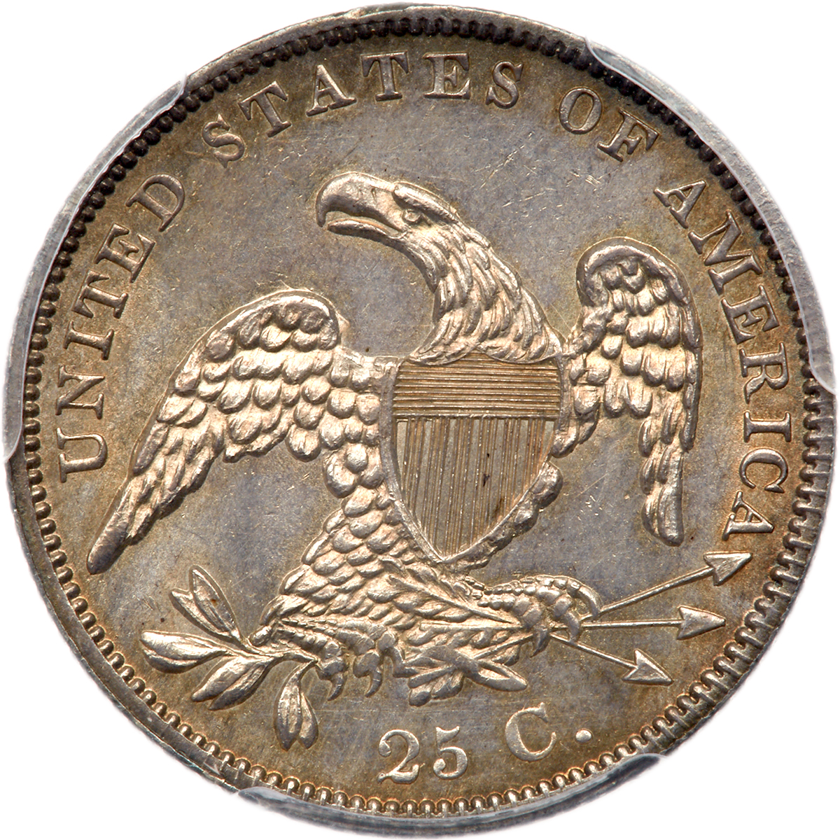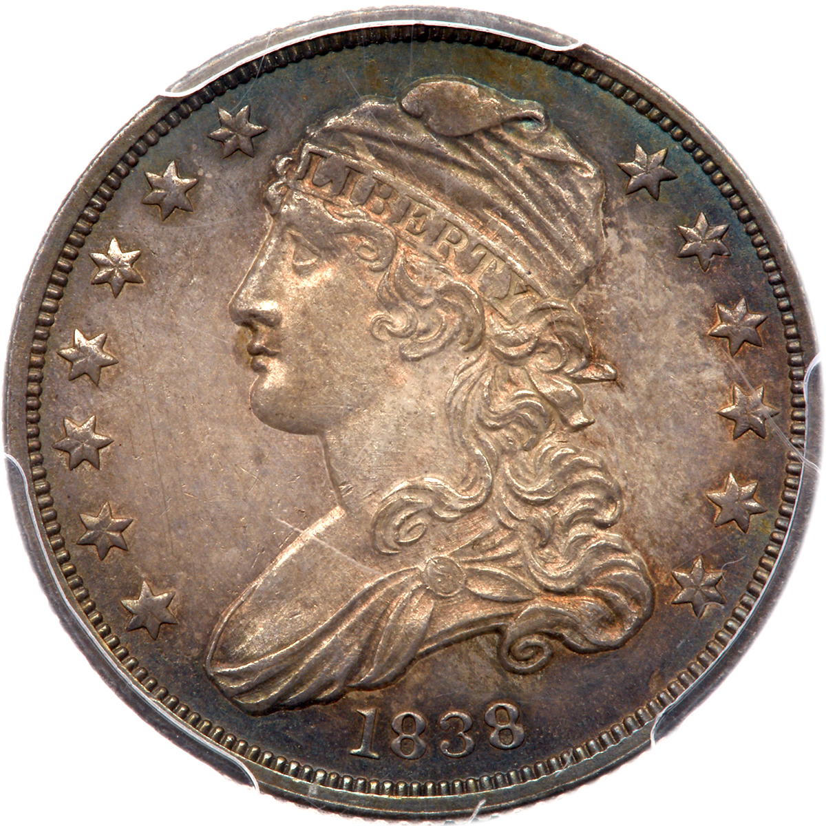 1838. Browning 1, Rarity 1. PCGS graded MS-64. The centers are nice and bold. Violet and deep blue colors around obverse rims while the reverse is mostly white. A great coin for a type set and this is the final year of issue of the Capped Bust quarters, as the Liberty Seated design was launched in the later portion of 1838 after these Capped Bust quarters were struck and released into circulation. Pop 3; 2 finer for the variety, 1 in 65, 1 in 66. (PCGS # 39015) Estimate Value $4,000 - UP
