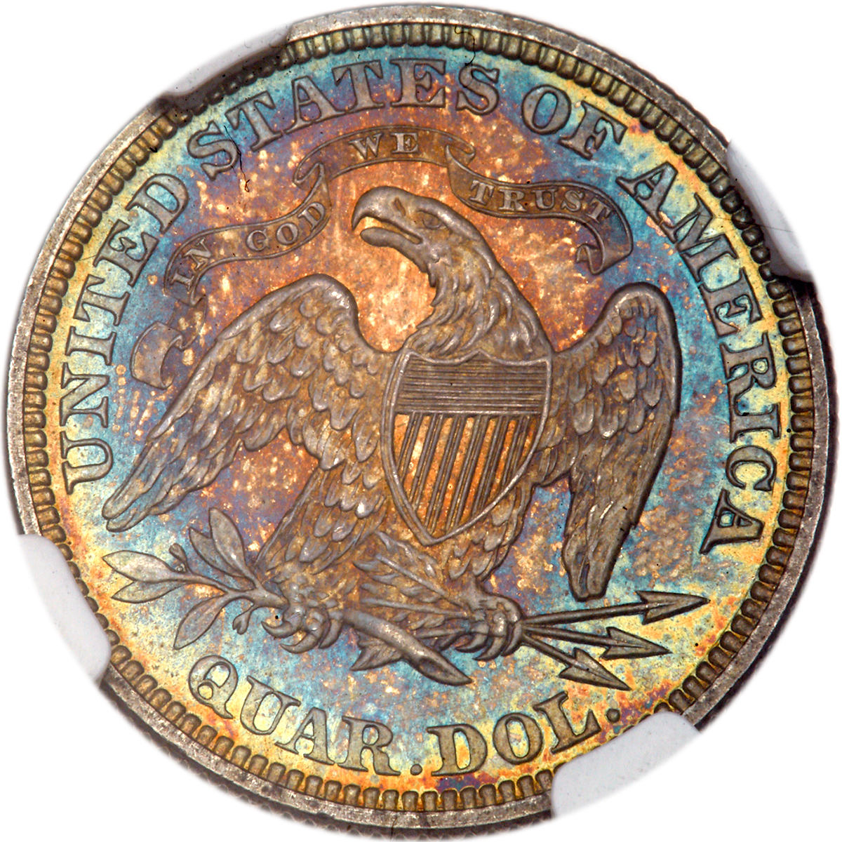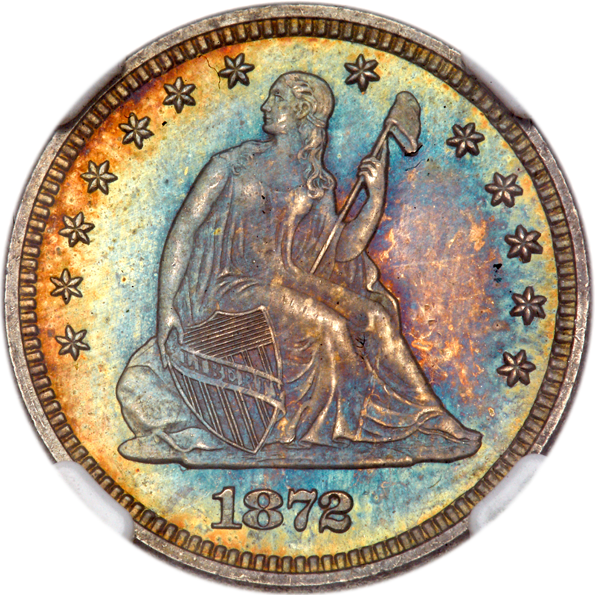 1872. NGC graded MS-66. A sharply struck gem with gorgeous rainbow toning of deep aqua blue surrounding with orange russet centers on both sides. While highly appealing for the color alone, the high technical grade adds to the desirability too. A condition rarity this nice, and worthy of the most advanced date collection. Pop 2; 1 finer in 67. Estimate Value $7,500 - UP