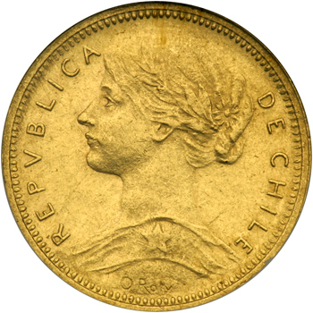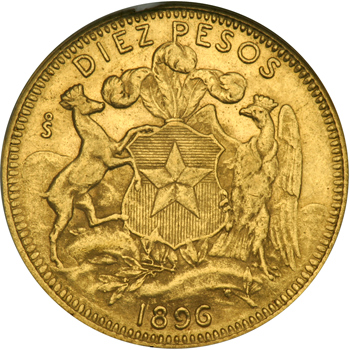 Chile. 10 Pesos, 1896-So. Fr-52; KM-157. Republic. NGC graded AU-58.