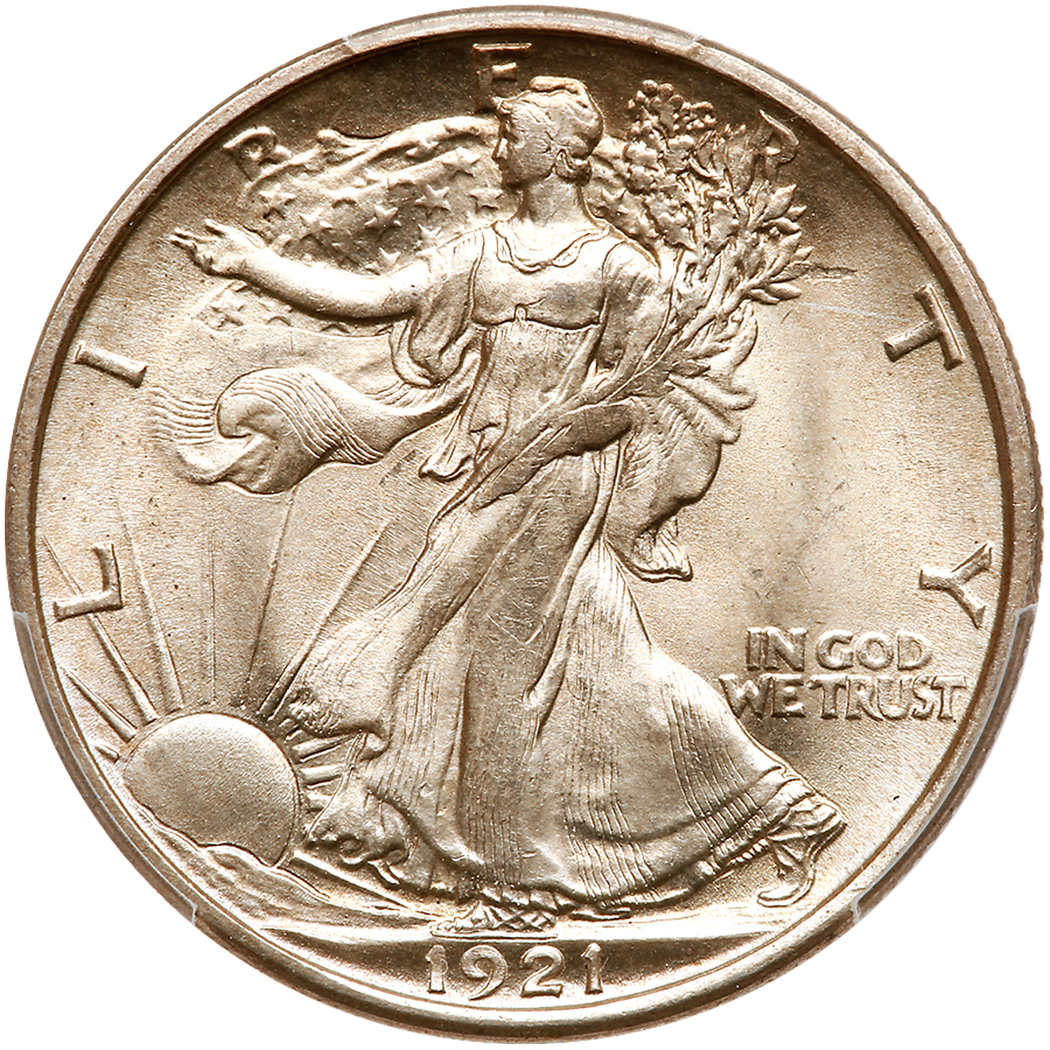 1921-D. PCGS graded MS-64+. CAC. PQ. This is the key date to the Walking Liberty half dollar series with a modest mintage of 208,000 pieces in all. From this challenging start, most entered circulation and stayed there long enough to be well into low grades, if they survived the melting pots at all. Here is one of the precious few, and we do mean that--that survived in near gem condition! The obverse and reverse are bathed in creamy white luster, with a better than average strike too, right down to Liberty's thumb that caressess her bundle of oak and laurel branches. The wide open fields are mint fresh and free of all but minute signs of contact, quite an event for this series.