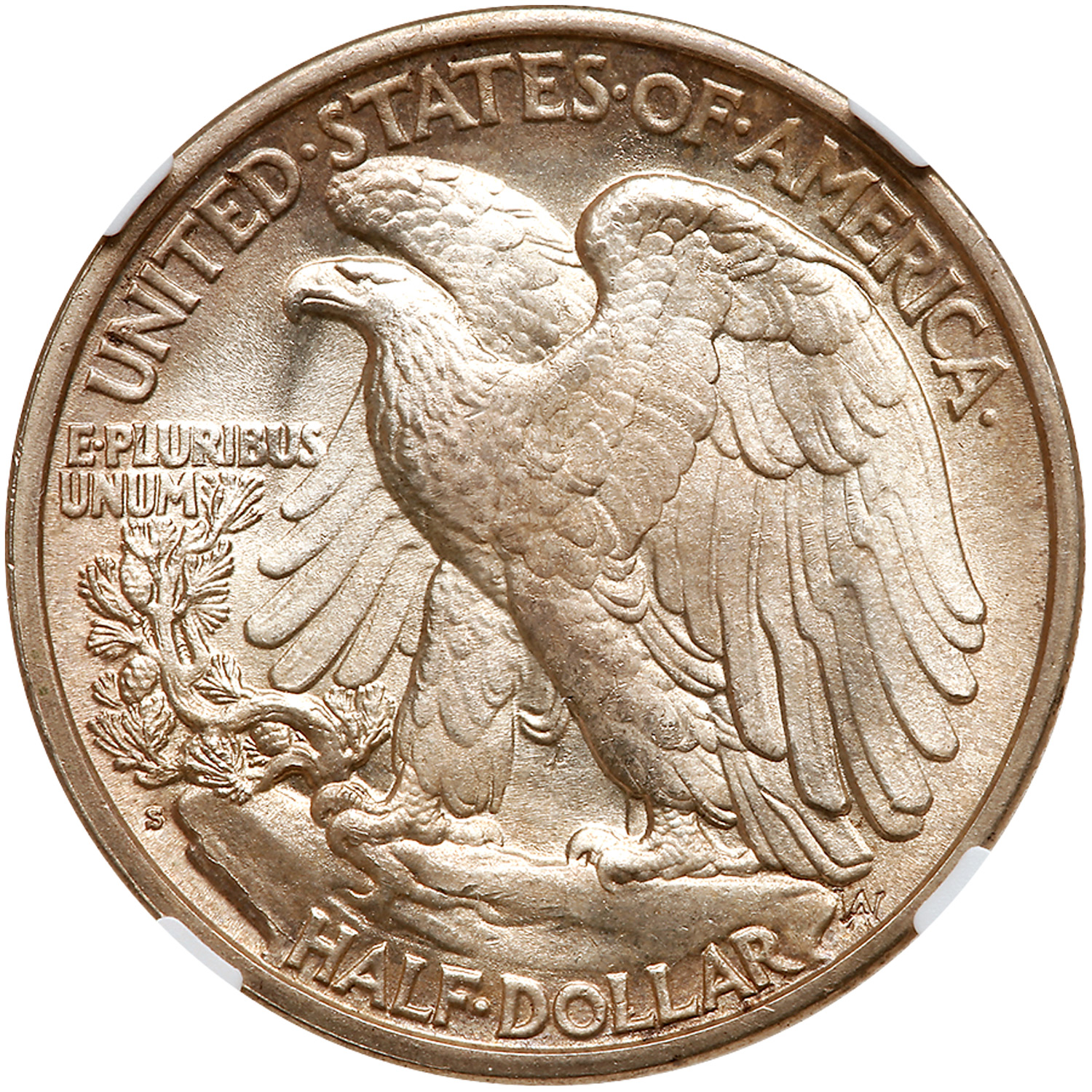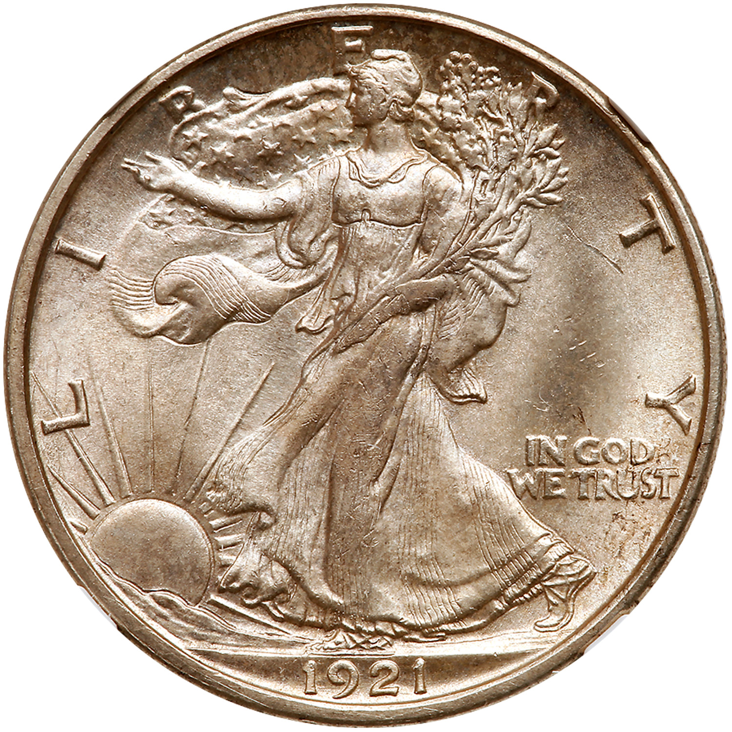 1921-S. NGC graded MS-65. Here is a premier condition rarity of the Walking Liberty half dollar series, the 1921-S in Gem mint state. After all the years of certified grading (35 years now!) to date NGC records only 23 grading events of a 1921-S grading MS-65 or finer (only 2 thus!). Duplication within those meager numbers is likely. What we have here is a coin of desitiny, a prize worthy of the great hunt--sought after by so many but attained by so few. This condition rarity will always be representative of the highest and best of this majestic series.