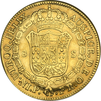 Colombia. 8 Escudos, 1816-Pn-FR. Fr-61; KM-66.3. Ferdiand VII. Bust of Charles IV right. Reverse: Crowned arms with Golden Fleece Collar. Adjustment marks and light scratch on obverse. NGC graded EF-40.