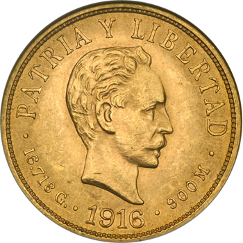 Cuba. 10 Pesos, 1916. Fr-3; KM-20. Head of Marti. NGC graded MS-63.