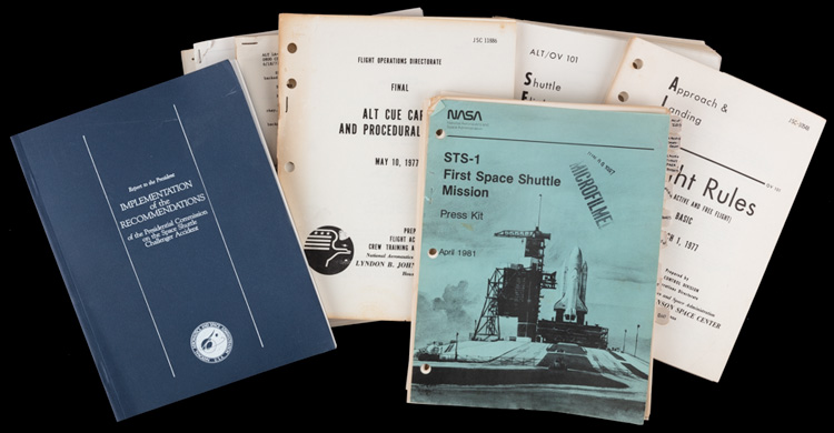 Full File Box Regarding Early Space Shuttle Materials Especially STS-1 and STS-2. Also Commission Reports on The Challenger Disaster. A full file box of press materials, briefings, 18 + files, some manuals and sizable documents from the early research of solid rocket booster, to ALT Flight Rules to early Shuttle Flights especially the first two. There are a lot of divisions at NASA represented here but all pertinent to the flight director for his files and review. Also included is a copy of the Report To The President: Implementation of the Recommendations of the Presidential Commission on the Space Shuttle Challenger Disaster published by NASA in June, 1987. Also included is NASA departmental assessment dated May 22, 1987 review every aspect of the disaster. Also included two much shorter summary publications for each report. Impressive archive of materials and well kept. Estimate Value $500 - UP