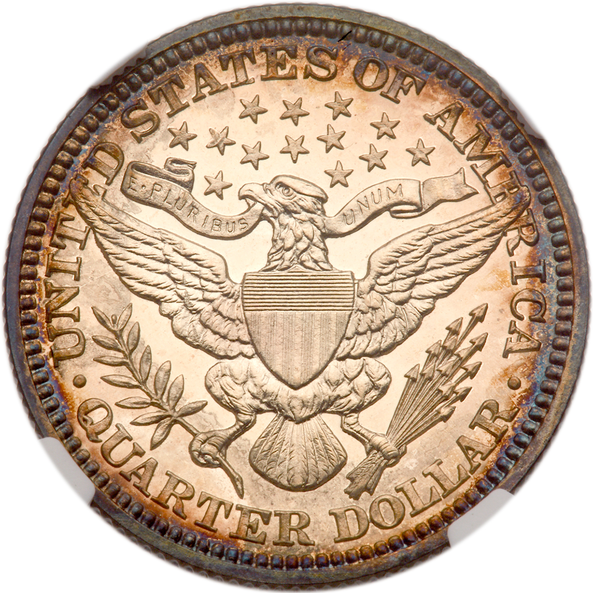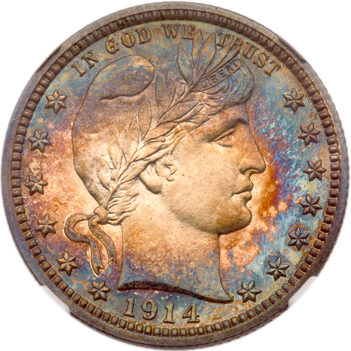 1914. NGC graded Proof 68. Lovely rainbow toning from rims on both sides, but particularly deeper and more attractive on the obverse. The reverse is framed in deep blue, while the center is bright white over the eagle. Strong technical quality for any date proof, and this one is far finer than usually seen. Only 380 struck. Pop 7; 5 finer, 2 in 68 Cameo, 3 in 68 Star. Estimate Value $6,000 - UP