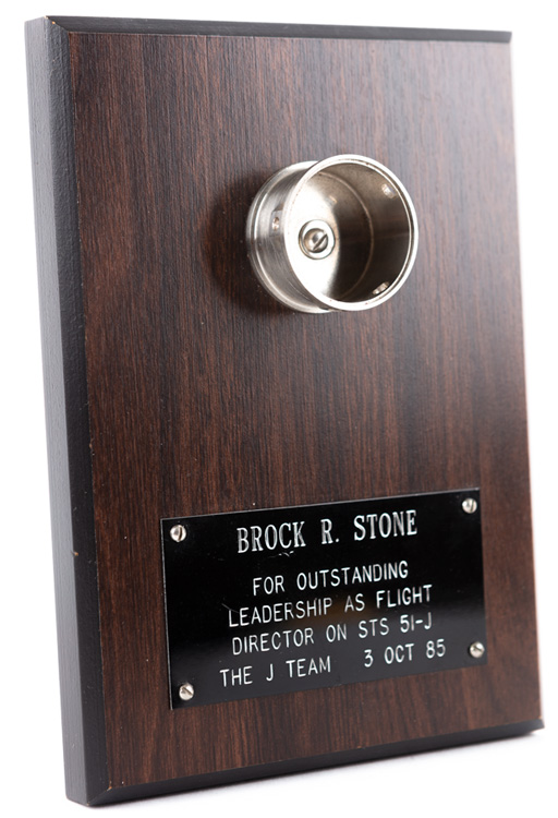 STS-51J, First Flight of Space Shuttle Atlantis, Presentation to the Flight Director with Hardward Piece Affixed. STS-51-J was the 21st NASA Space Shuttle mission and the first flight of Space Shuttle Atlantis which flew Oct. 3-7. Offered is a plaque recognizing the flight director for his "Outstanding Leadership As Flight Director on STS 51-J, 3 Oct. 85, The J Team". Affixed is likely a flown piece of hardware (note, sharp edges), 7 x 5 with award in overall excellent condition. Estimate Value $200 - UP