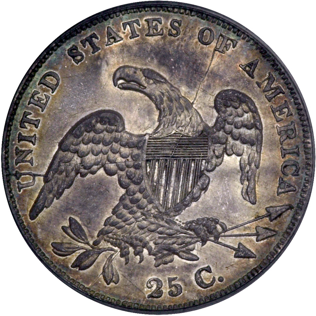 1836 Capped Bust Quarter Dollar. PCGS graded AU-58. This is an important and rare coin in high grade and certainly high in the Condition Census for the variety, if not the very finest. In the June 1998 quarter variety census published in the John Reich Journal, the finest noted in that Census was AU-50. While it is possible that a few more high grade examples of this variety reside in type sets, what is known is that this is presently the best known example in the census. As to the coin itself, it is a magnificent example for the date, with lovely gray toning with blue highlights near the edge. There are some very minor surface marks, apparently from brief circulation, but they are not detracting. Struck after the dies had both cracked, the obverse with a roughly vertical bisecting break through the B of LIBERTY to just right of the 6 in the date, and another heavier crack through the top two points of the first star to Liberty's neck. Similar on the reverse, there is a vertical bisecting crack from F of OF through the shield, lowest pair of leaves to edge, and another through the U of UNITED to the central shield. These die breaks apparently retired the dies early, as this variety has not turned up in great numbers.