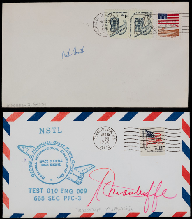 STS-51-L (Challenger Tragedy) Two Signed Covers: Mike Smith, Pilot and S. Christa McAuliffe, Teacher. Challenger STS-51-L: Captain Mike J. Smith (1945-1986) pilot of the Challenger and Sharon Christa McAuliffe (1948-1986) school teacher from Concorde, New Hampshire. Two individually signed covers. One a simple cover with postage canceled at Kennedy Space Center, November, 1981 with Smith signing in blue ball point in his usual small handwriting. McAuliff has signed boldly in red Flair a George C. Marshall Space Flight Center, Rockwell International Rocketry Division. cover stamped March 15, 1980. Both are in excellent condition. Estimate Value $300 - UP