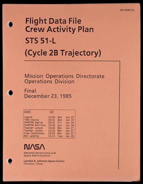 Flight Data File Crew Activity Plan STS 51-L For Challenger. STS-51-L Flight Data File Crew Activity Plan completed by Mission Operations Directorate. Activity Plans outline virtually every hour during the mission even detailing when to sleep and eat in order to stay on schedule in executing all the objectives. These plans were all printed on heavy card stock due to zero gravity conditions. This likely the back-up copy for Mission Control. Unfortunately the tragedy at lift off and including the loss of Christa McCauliff in teaching students via broadcast from the shuttle the objectives were never realized. Near to mint condition. Usually these manuals have rings in the pre-punched holes for easy flipping of each page but this manual was ultimately never used on the ground and filed away hence the condition. Estimate Value $200 - UP