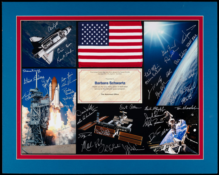 STS-110 Shuttle Atlantis Flown US Flag on Spectacular 4 Color Photo Montage With Over 40 Signatures All in Silver Pen. Spectacular award presentation piece for the dedication and service of an astronaut trainer and Mission Control specialist from The Astronaut Office of NASA boasting over 40 signatures. Included are several crews from Shuttle flights including STS-110 and many ground crew. Four photos create the presentation including Atlantis' launch, the cargo doors open to reveal the truss segment for the Space Station, a great image of the Station and two crewmen walking in space. Centered is the flown flag all beautifully matted. Presentation with double mat measures 16 x 20". One of the nicest Shuttle presentations we have seen. Estimate Value $500 - UP