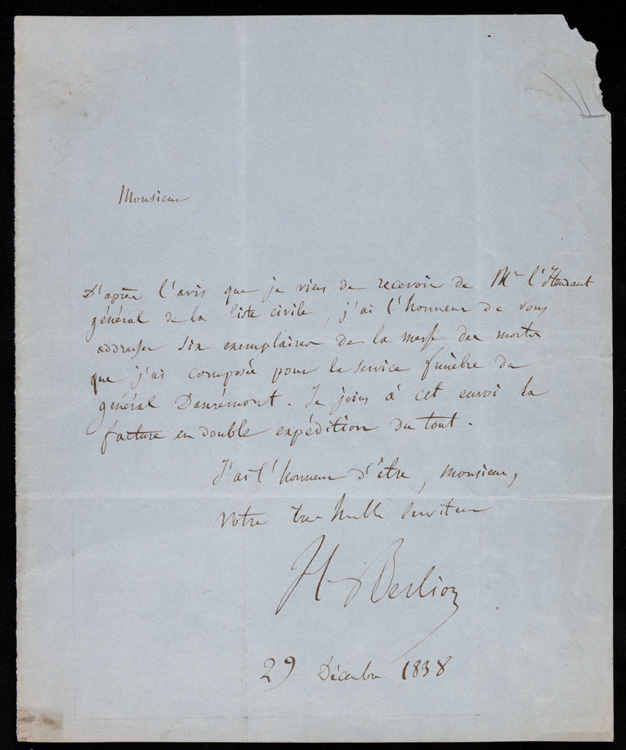 Berlioz, Hector -- ALS Re "Mass of the Dead" Composed for General Charles-Marie, Comte Denys de Damrémont. (1803 - 1869) French composer. Autograph letter signed "H. Berlioz," one page, 7¾ x 6½", in French, n.p., December 29, 1838. To an unidentified person, saying he is sending six copies of his Mass of the Dead (not present) which he composed for the funeral service of General Damrémort [who was killed in the Revolution of 1830]. He is also attaching the invoice. Light toning; small paper loss at upper right corner, affecting nothing.