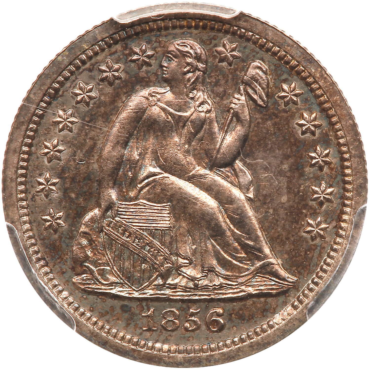 1856. Small date. PCGS graded Proof 65. Well struck with lovely toning on both sides from long and careful storage. The strike is precise and full, as expected for a Proof. These were issued in small numbers, and hence some care was executed in their striking. This one has been carefully preserved since the day it was struck, hence is still retains the gem grade. Only 50 pieces issued. Pop 5; 7 finer, 4 in regular proof, 3 in Proof Cameo. (PCGS # 4745) Estimated Value $5,500 - 6,000