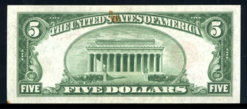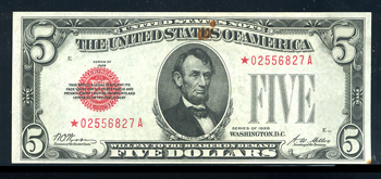 Fr-1525*. 1928, $5 Legal Tender Note. . Fr-1525*. . KL-1639*. PCGS Apparent Choice About New 55, Rust Stain. Despite the rust stain at the top center, this is a high grade example of this scarce star note.